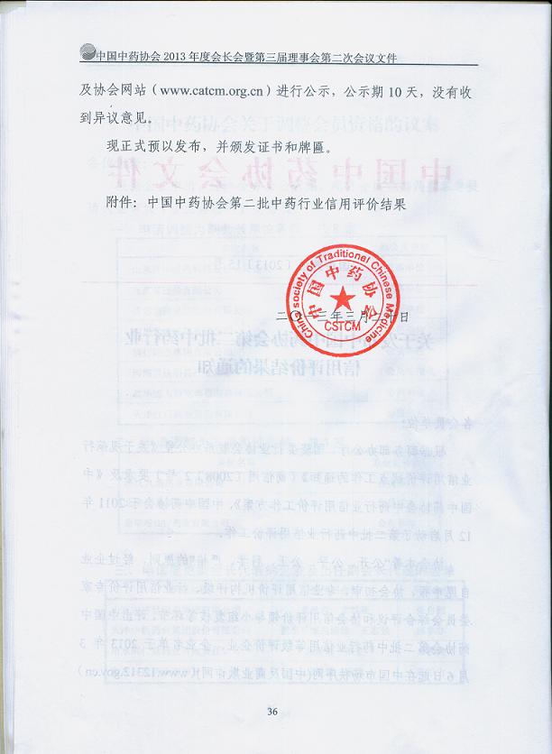 根據中國中藥協會《關于開展第二批中藥行業企業信用評價工作的通知》(國中藥協〔2011〕46號)文件精神,我公司參加了第二批中藥行業信用評價工作。中國中藥協會本著“公開、公平、公正、科學、嚴格”的原則,經過協會初審、專業信用評價機構評級、行業信用評價專家委員會綜合評議和協會信用評價領導小組復核等環節,評出包括我公司在內的9家AAA級信用企業,并將企業名單于2013年3月6日起在中國市場秩序網(中國反商業欺詐網)(www.12312.gov.cn)及中國中藥協會網站(www.catcm.org.cn)進行了公示。