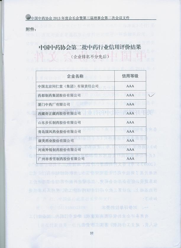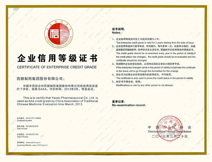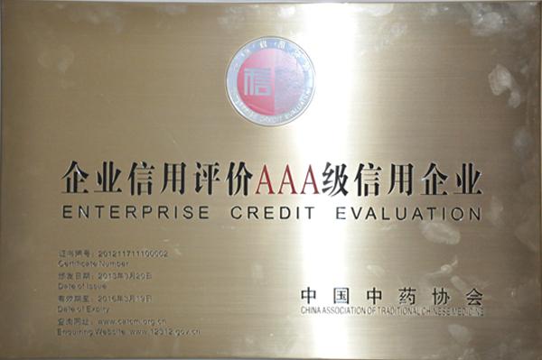 2013年3月20日,中國中藥協會正式發布了關于第二批中藥行業信用評價結果,我公司被評為AAA級信用企業。