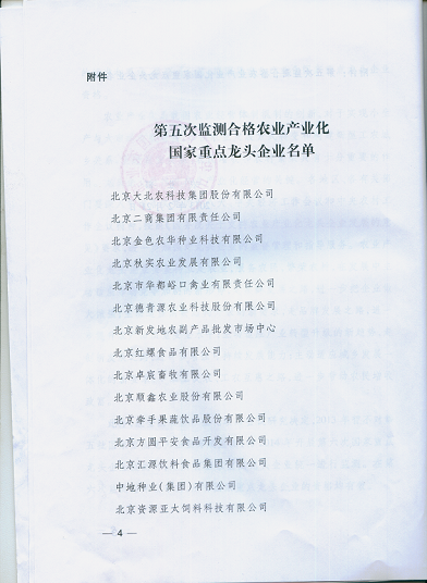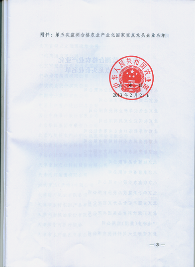2013年2月,經(jīng)全國農(nóng)業(yè)產(chǎn)業(yè)化聯(lián)席會議審定,農(nóng)業(yè)產(chǎn)業(yè)化國家重點(diǎn)龍頭企業(yè)第五次監(jiān)測我公司被認(rèn)定為合格。