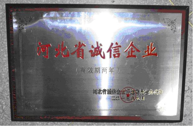 2013年9月27日,河北省誠信企業(yè)評選委員會在省會石家莊召開了2013年度誠信企業(yè)表彰大會,對榮獲2013年河北省誠信企業(yè)進(jìn)行了表彰 (冀誠企評辦[2013]16號),我公司連續(xù)被評為“河北省誠信企業(yè)”。